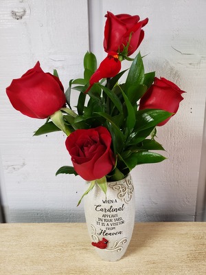 This lovely arrangement comes in a decorative container that has a cardinal on it. It reads "When a cardinal appears in your yard, it is a visitor from heaven". It contains red roses and a cardinal stick in.