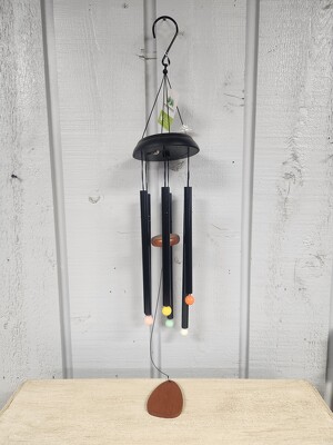 This lovely wind chime black metal with wood accents. Each chime is has a different color solar activated light at the bottom.
