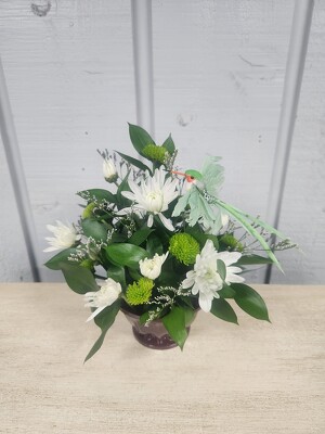 This adorable arrangement comes in a magenta colored container. It is filled with white and green flowers. It is accented with a hummingbird.