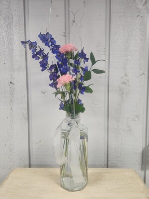 This lovely comes in a tall clear vase. It contains blue and pink flowers. It is accented with a silver ribbon around the neck of the vase and silver ting ting.
