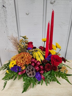 This lovely centerpiece is longer than it is round. It contains two candles and fall colored flowers such as daisies, roses, and more. It is accented with a gourd, lotus pod and a bow.