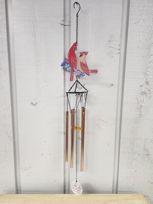 This lovely wind chime has bronze chimes. It is topped with colored metal cardinals. The piece on the bottom reads "Cardinals appear when Angels are near."