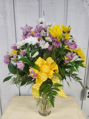 This lovely arrangement comes in a clear, glass urn shaped vase. It contains mixed colored daisies and is accented with a bright colored bow.