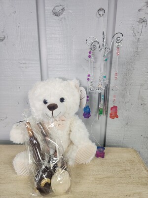 This lovely gift will come all in a bag. It contains a teddy bear, a bag of mixed chocolates and a wind chime with rainbow teddy bears.