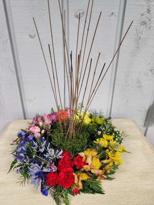 The colors of the rainbow in this amazing wreath create a kaleidoscope appearance. The multitude of textures and patterns add to the depth of character in this unique floral tribute.