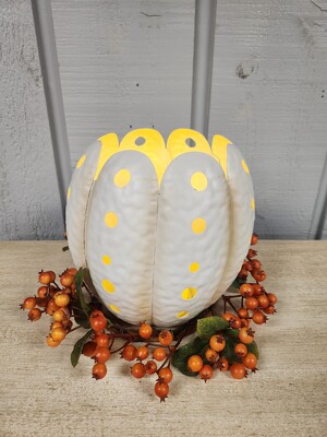 This lovely metal lantern is battery operated and can be turned on a timer. It comes with a silk wreath of orange berries.