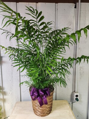This Neanthe Bella Palm comes in a wicker basket. It is accented with a bow.