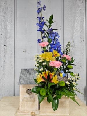 This stunning arrangement comes in a wooden birdhouse. It contains brightly colored flowers such as alstromeria, delphinium, and carnations. It is accented with a bird sitting in a nest.