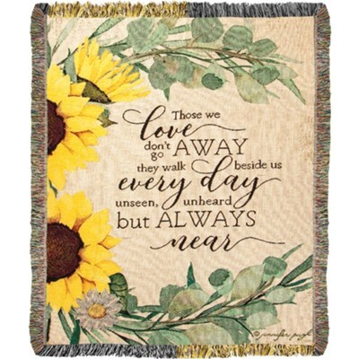This lovely throw depicts sunflowers and reads "Those we love don't go away, they walk beside us everyday unseen, unheard but always near".